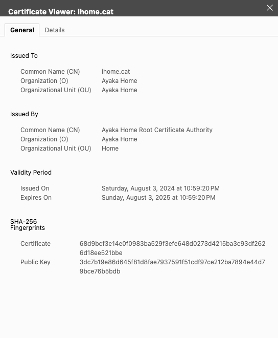 subject=C=CN, ST=Shanghai, L=Shanghai, O=Ayaka Home, OU=Ayaka Home, CN=ihome.cat, [email protected]