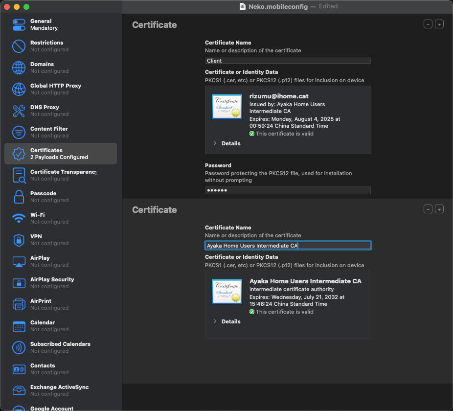 openssl pkcs12 -export -in clients/neko/2024/client.crt -inkey clients/neko/2024/client.pem -certfile intermediates/legacy/home_ca_intermediate_1_bundle.crt -out clients/neko/2024/client.p12 -legacy成功导入到 KeyStore 里面之后记得删除私钥和证书签发请求文件