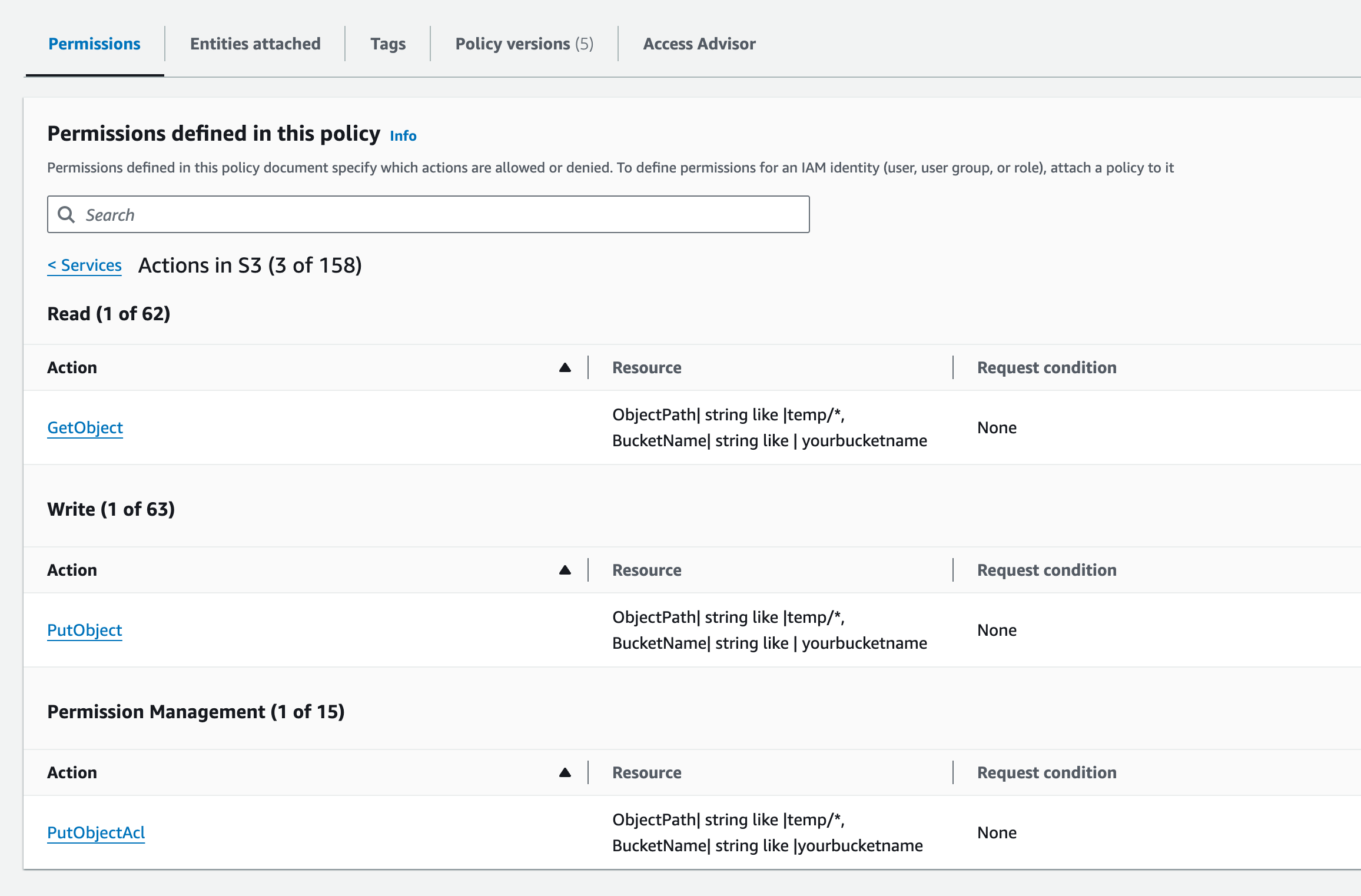 "Resource": "arn:aws:s3:::yourbucketname/temp/*"