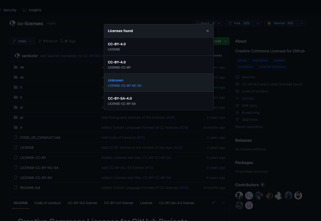 但是这与我们所使用的 CC 协议文本无关,因为我们是直接从 santisoler/cc-licenses: Creative Commons Licenses for Github 复制过来的 CC 协议原文,如果这个时候去他们的仓库查看协议,可以发现他们的 CC 开源协议也是无法被识别的,会被识别为 Unknown,但是其他的 CC 协议就能正常被识别出来: