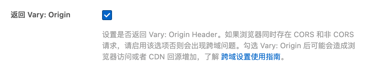 此刻我们再去看看阿里云 OSS 的跨域设置选项当中的最后一项下面的注释:返回 Vary: Origin