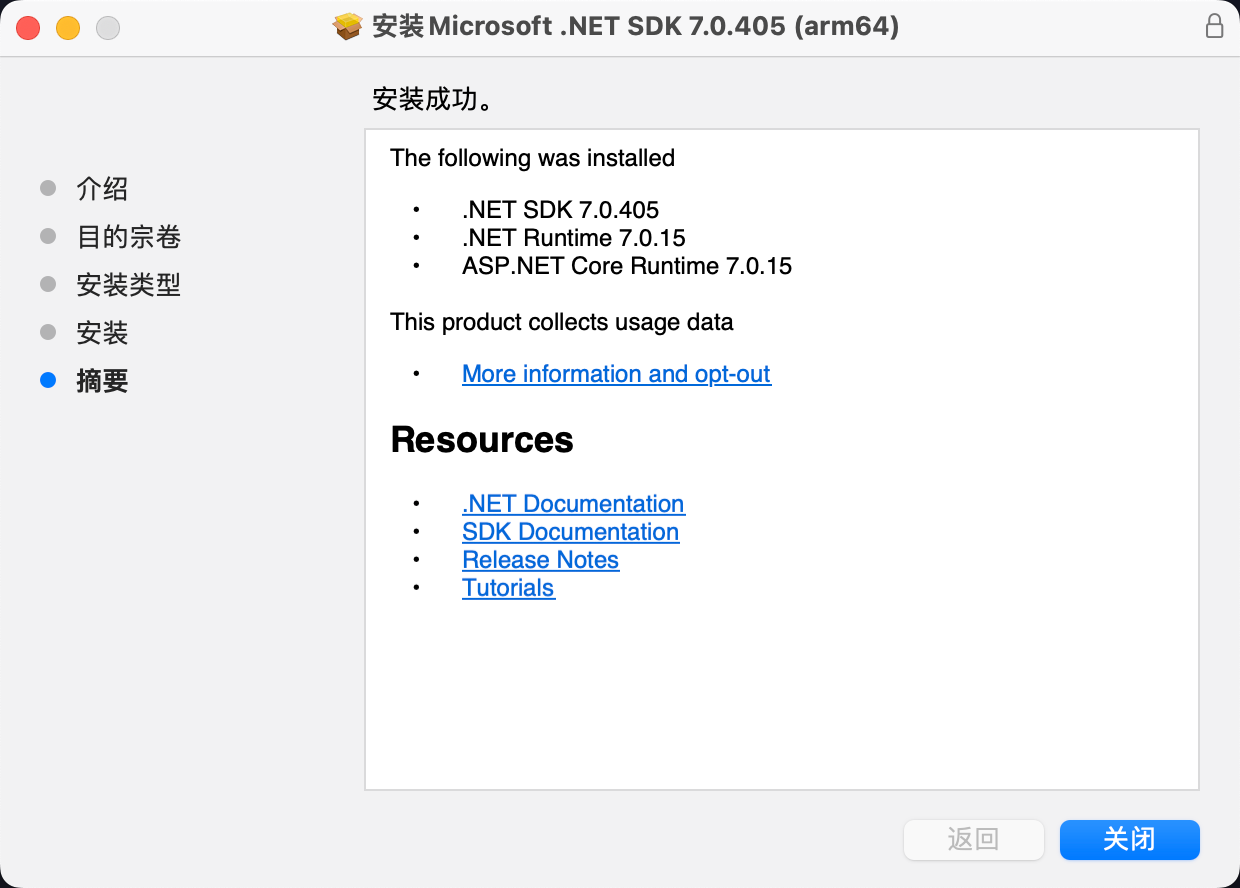 对于 macOS Arm64(Apple Silicon M 系列芯片)可以在这里下载:下载 .NET 7.0 SDK (v7.0.405) - macOS Arm64 Installer