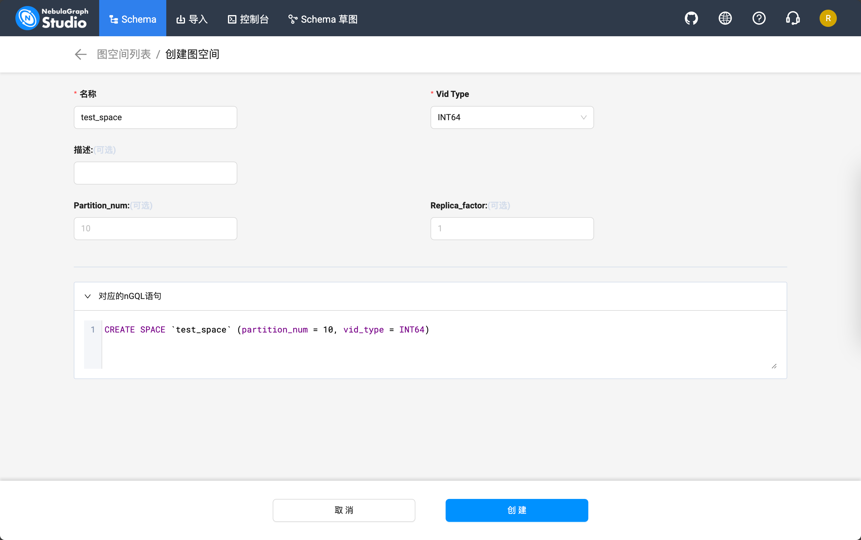 CREATE SPACE `test_space` (partition_num = 10, vid_type = INT64)创建完成之后应该是这样的:
