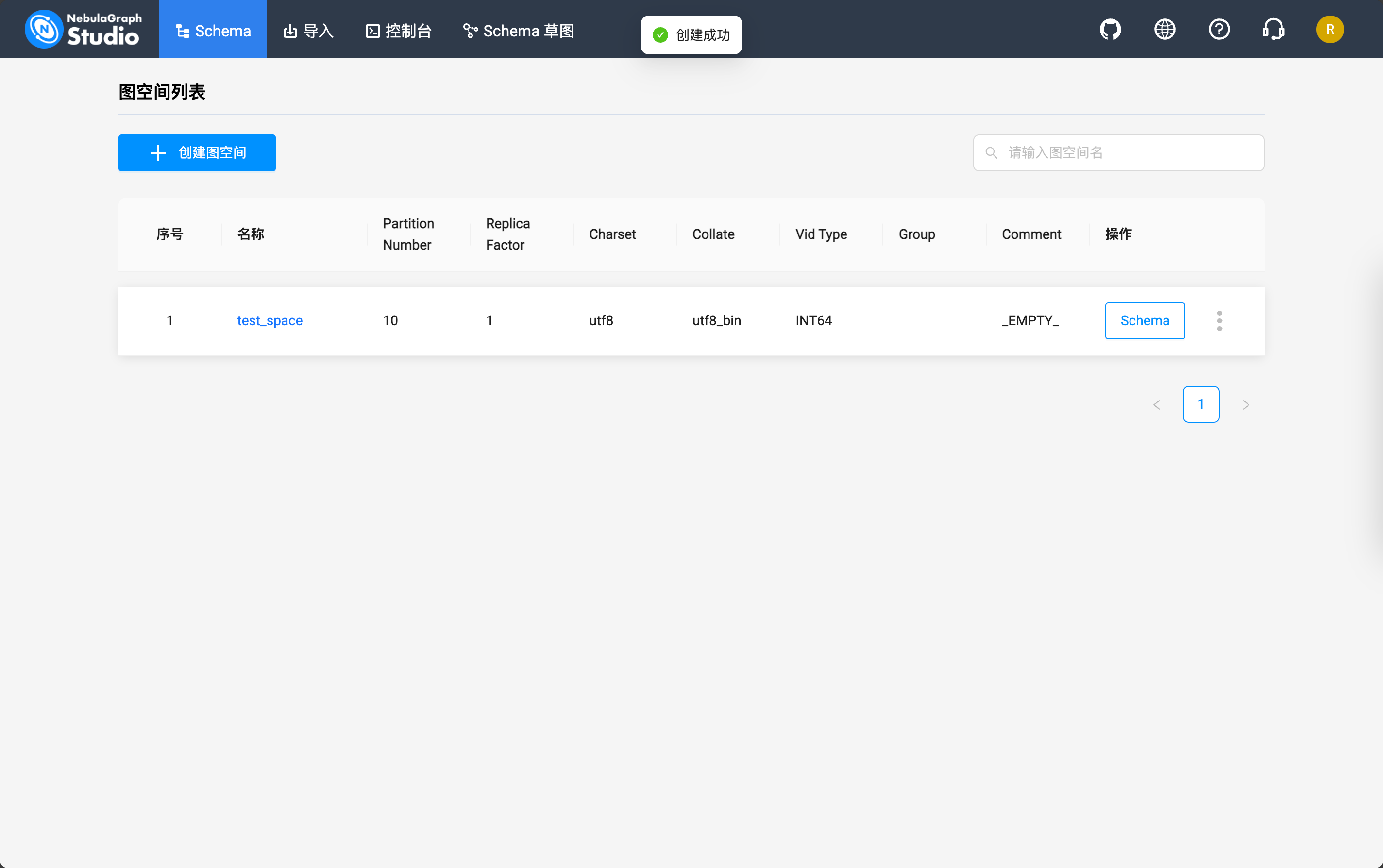进入之后可以通过 Schema 这个标签页创建一个测试用的图空间: