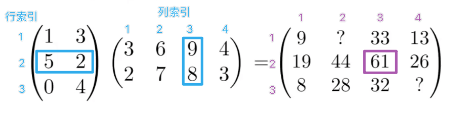 计算 x 行 y 列 位置的结果时,只需将 a 矩阵中 x 行 和 b 矩阵中 y 列的向量进行点乘即可。