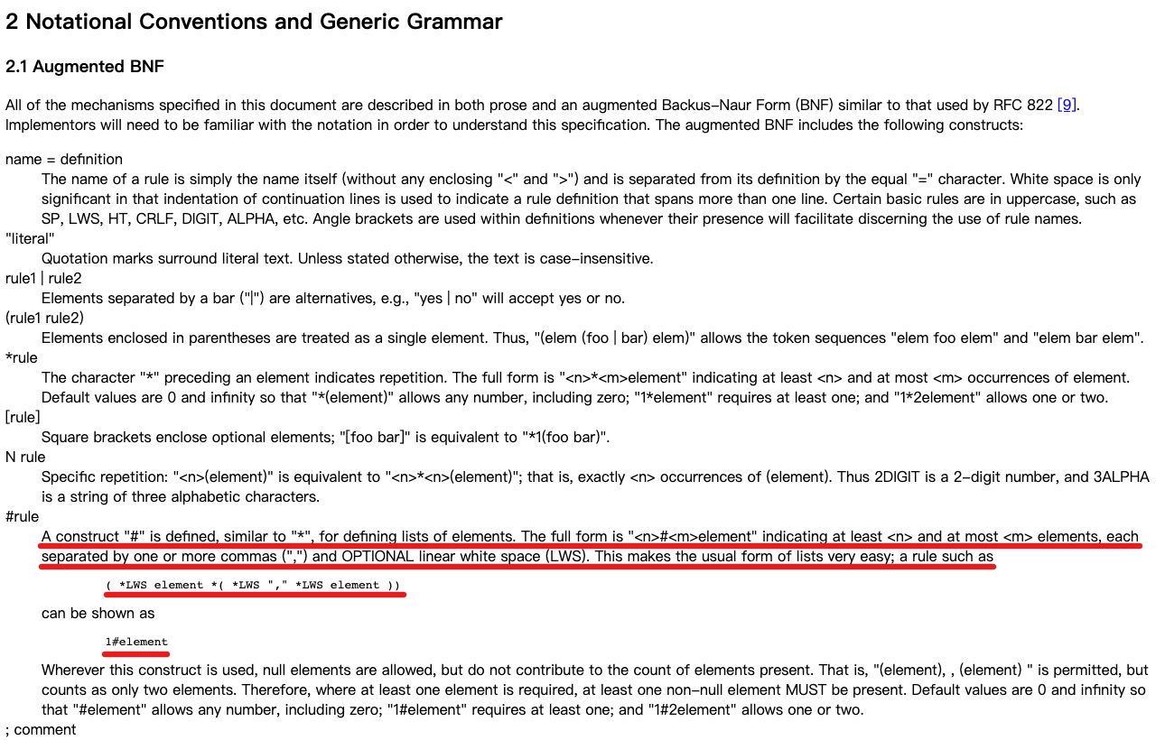 顺藤摸瓜找到 RFC2616 的第二部分:Notational Conventions and Generic Grammar (符号约定和通用语法) 可以看到对上面提到的 1#cache-directive 层级的说明。